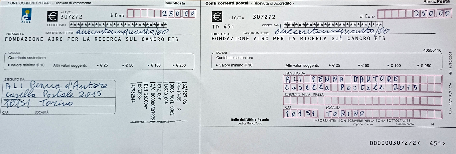 Associazione Italiana per la ricerca sul cancro: 250,00 euro (04/06/2019)