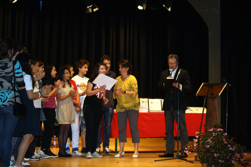 La professoressa Mara Maglione premia i ragazzi della Scuola G.B. Viotti di Torino.